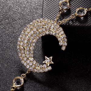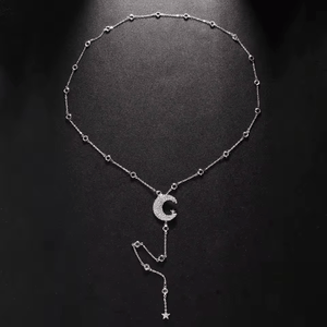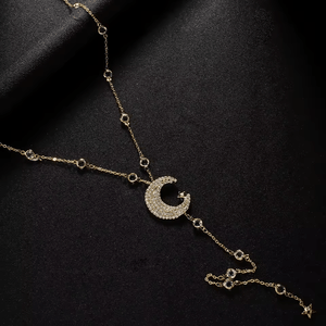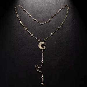 Step into a world of celestial beauty with this stunning Moon and Stars Back Necklace. Designed for dreamers, stargazers, and lovers of all things ethereal, this delicate piece cascades down your back like a shimmering night sky. Whether you’re dressing up for a romantic evening, a special event, or simply want to add a touch of cosmic elegance to your look, this back necklace is the perfect accessory to enchant and mesmerize.