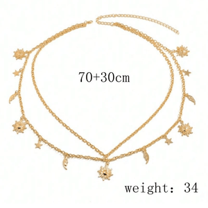 This Belly Necklace Chain features a stylish criss-cross design at the center, adorned with delicate summer-themed charms like seashells, stars, and sun symbols. A striking piece that brings a beachy, boho feel to any outfit. Light, feminine, and full of vacation energy, it’s your new favorite accessory.