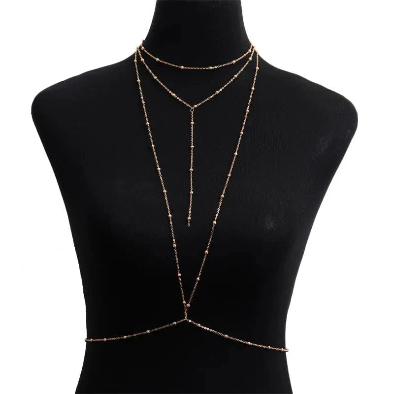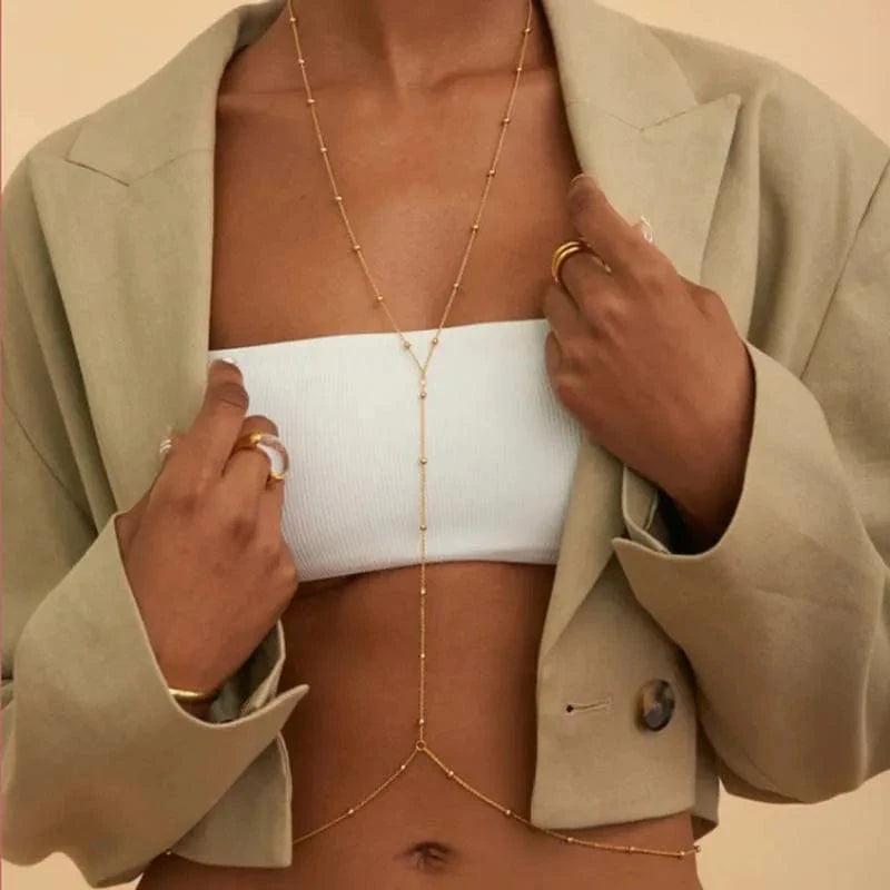 Highlight your silhouette with chest jewelry, the accessory that blends sensuality, elegance, and modern fashion. Draping gracefully across the body, this unique piece draws attention to your neckline and curves, adding a touch of confidence and glamour to any outfit. Whether subtle or daring, chest jewelry is the ultimate statement accessory.