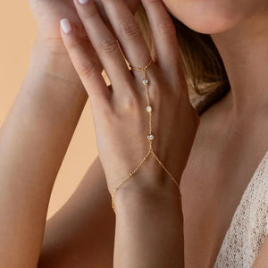The Rhinestone Hand Chain is a dazzling accessory that connects the wrist and finger with a delicate chain adorned with shimmering rhinestones. Its radiant sparkle makes it the perfect piece for weddings, parties, festivals, or evening wear.