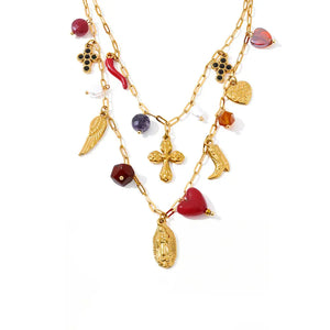 Our Double Charm Necklace is the perfect blend of modern layering and symbolic style. With its two delicate chains and meaningful charms, this piece instantly enhances your neckline while adding personality and effortless elegance. Light, expressive, and designed to shine, it’s the must-have accessory for women who love chic, eye-catching details.