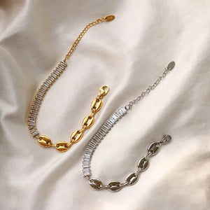 Our Zirconium Coffee Bean Bracelet marries the unique allure of coffee with the sparkling elegance of zirconium. Designed for those who appreciate a touch of glamour alongside their love for coffee, this bracelet features coffee bean-shaped links encrusted with zirconium stones. It's a piece that not only showcases a love for coffee but also adds a radiant sparkle to any outfit, making it perfect for both casual and formal occasions.