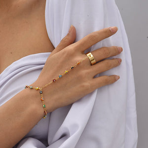 Introducing our Evil Eye Ring Bracelet, a mesmerizing piece that combines the timeless protection of the evil eye with the beauty of fine jewelry. This exquisite accessory features a bracelet elegantly connected to a ring by a delicate chain, adorned with an evil eye charm. Crafted from premium materials, this bracelet and ring combo serves as a stylish guardian against negative energies, embodying both protection and elegance.